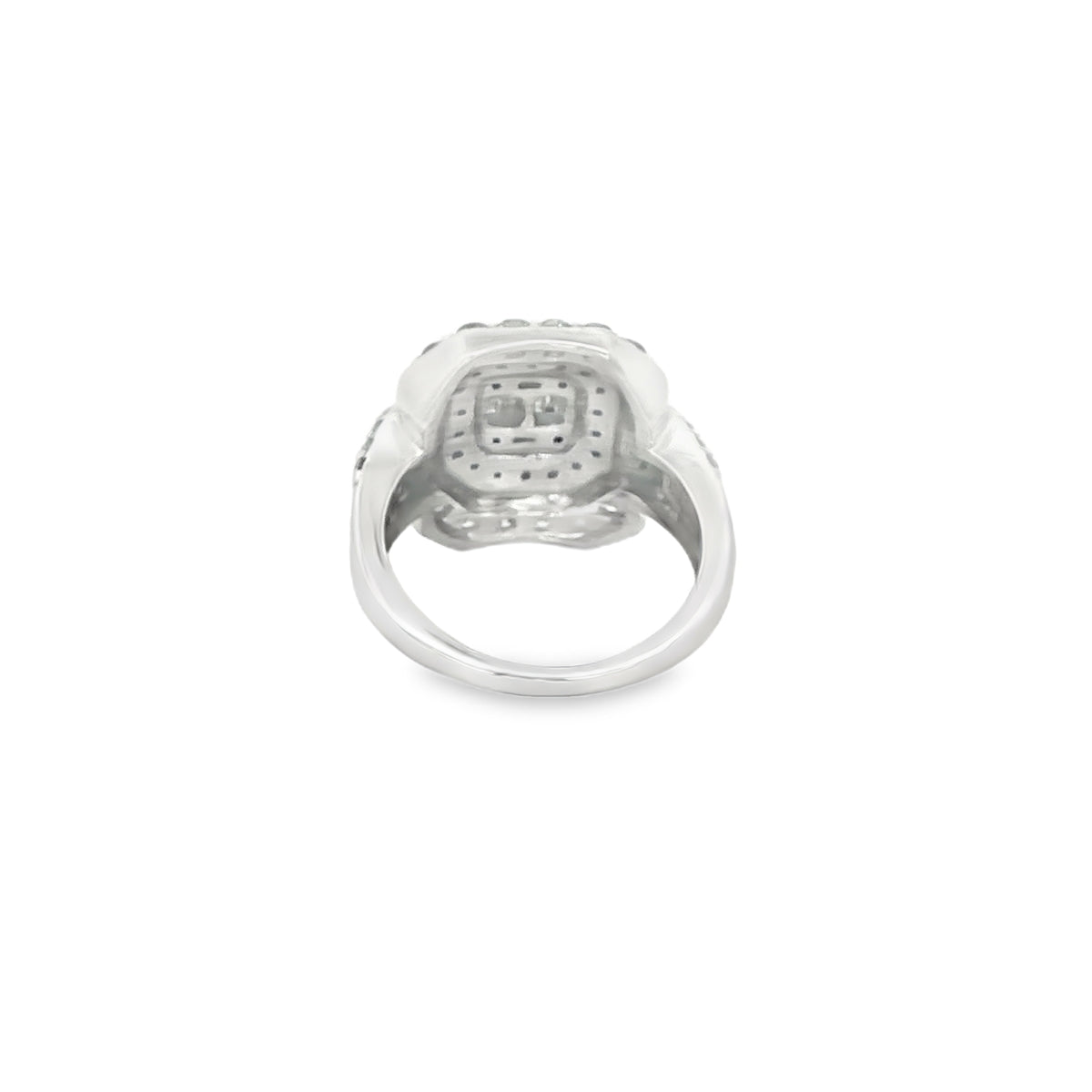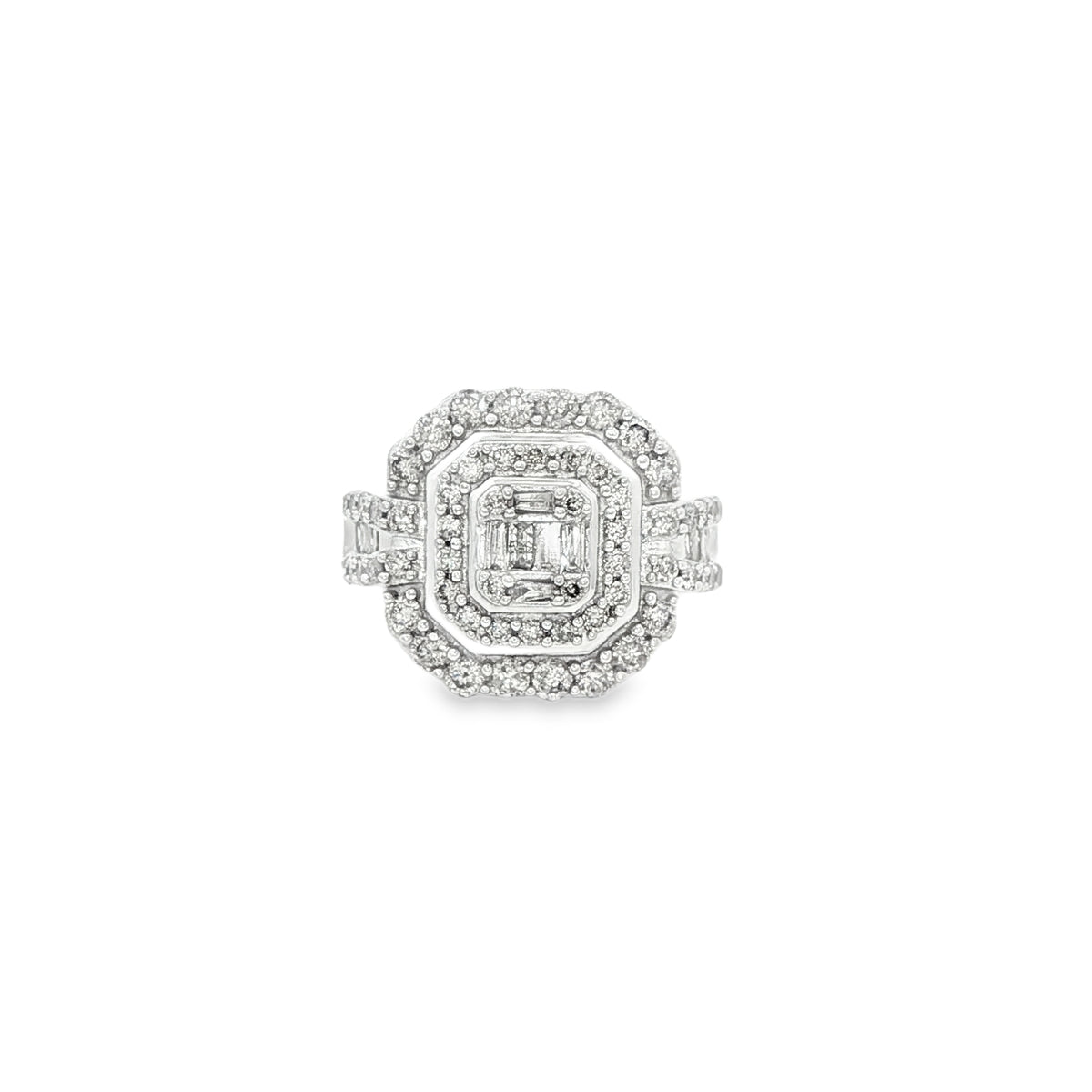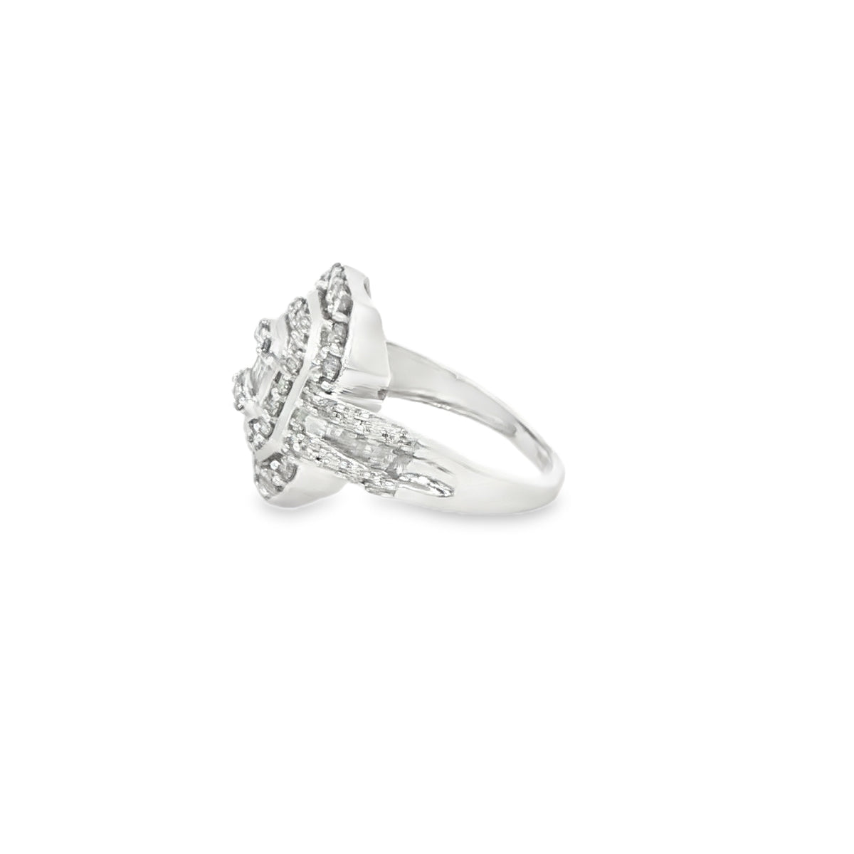 10 KARAT RING SIZE 5 WEIGHT: 5.4G : NATURAL DIAMOND BAGUETTES TRIPLE HALO