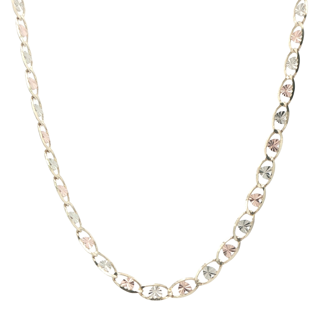 14 KARAT CHAIN LENGTH: 18 3.4MM HEART STARBURST TRI COLOR