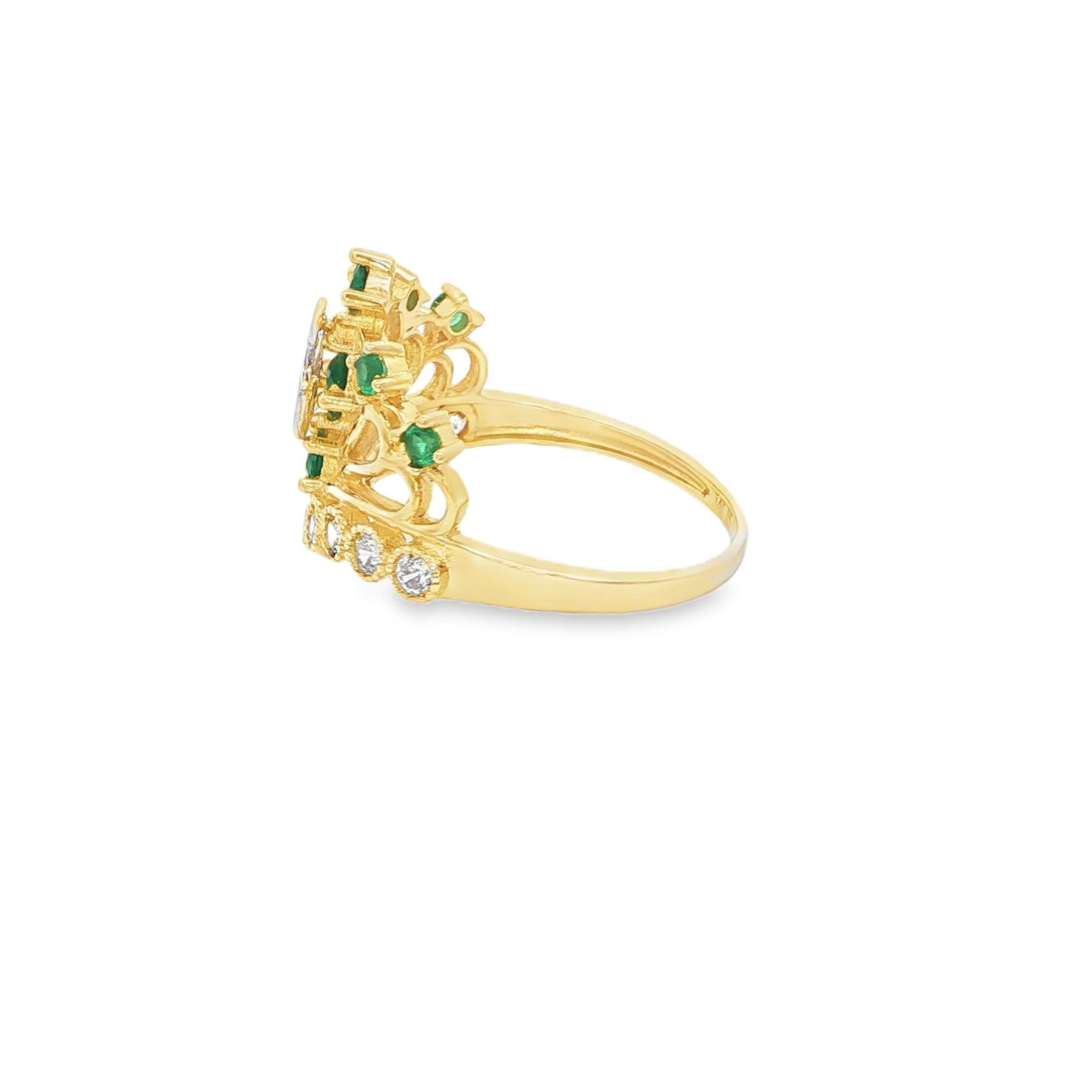 14 KARAT RING SIZE 7 WEIGHT: 3.1G : CZ QUINCE 15 GREEN CLEAR STONES CROWN FAN